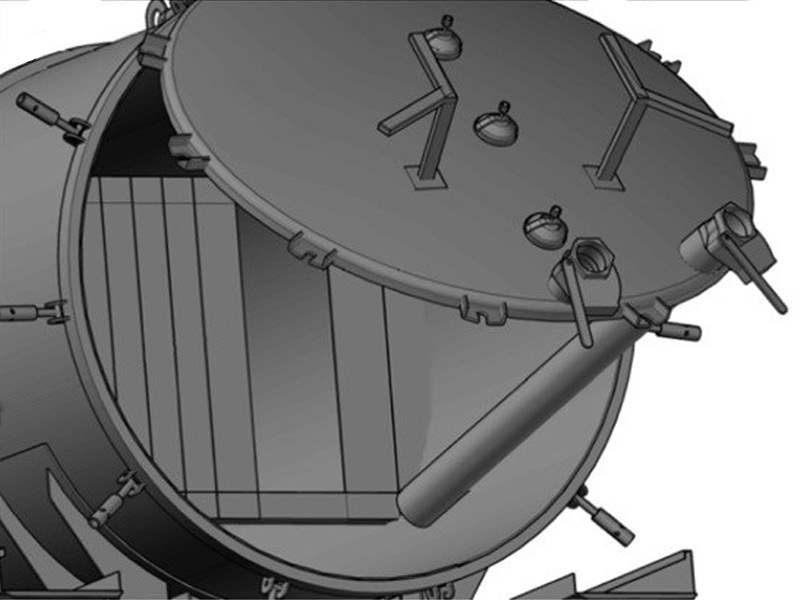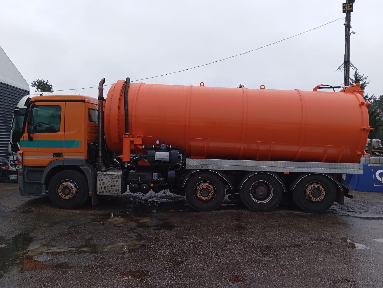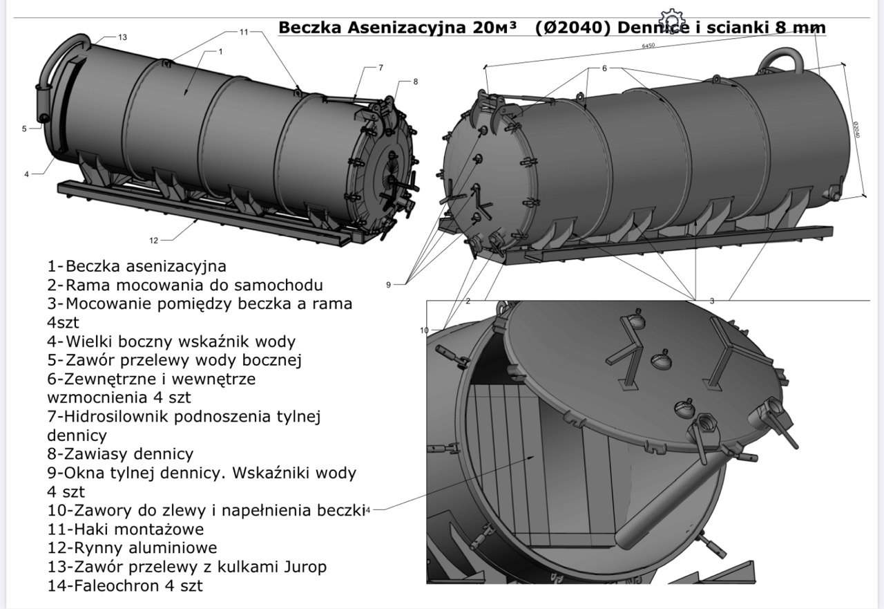 Solidny stalowy zbiornik o pojemności 20 m³, wykonany z blachy S235 JR o grubości 8 mm. Konstrukcja wzmocniona żebrami usztywniającymi i wyposażona w cztery falochrony, które zmniejszają obciążenia dynamiczne podczas pracy.